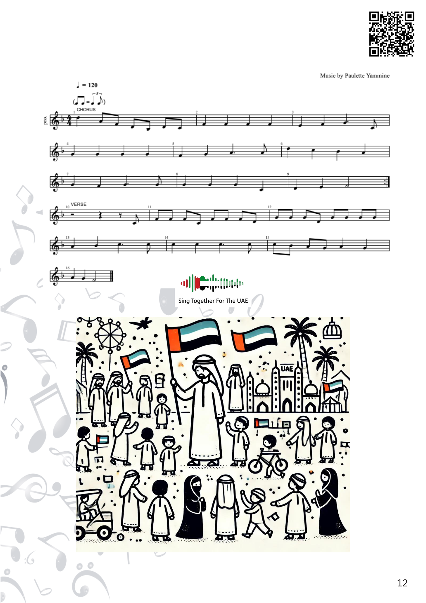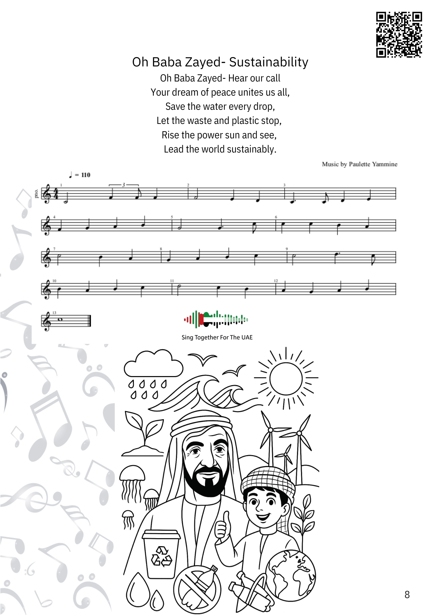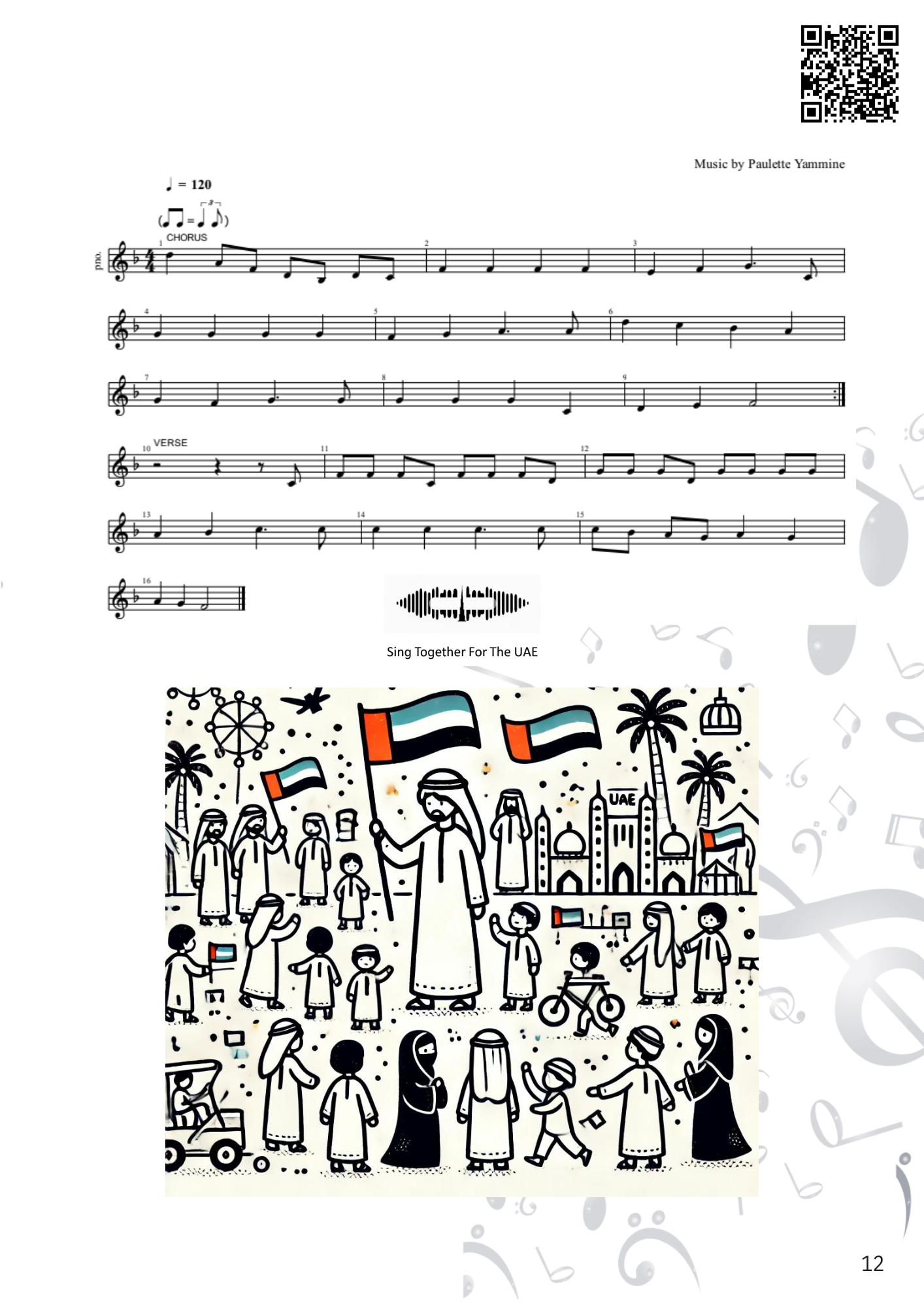 The illustration represents the theme of the song and is designed for students to colour, helping them connect visually and creatively to each UAE value and tradition.